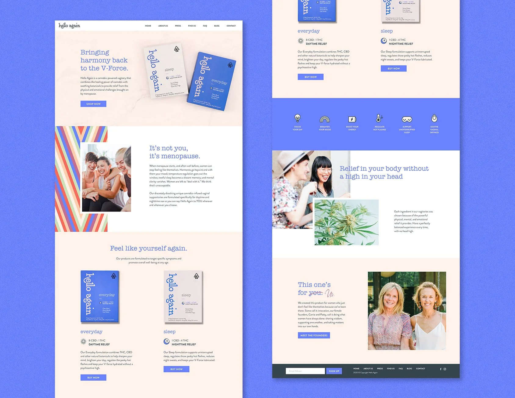 Utilizing the brand assets Clever Creative designed for THC/CBD menopausal vagitory brand, Hello Again, I created a website that spoke to the brand mission and values. From there, we also created branded collateral pieces to support in-dispensary demos and spread the word about this feel-good product for women.